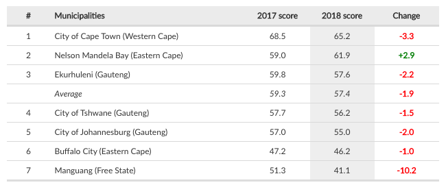 All other municipalities have produced a lower performance from last year. Cape Town is still the leader with 65.2, while Ekurhuleni, eThekwini, Nelson Mandela Bay and Tshwane are on par with the industry, despite their declines.