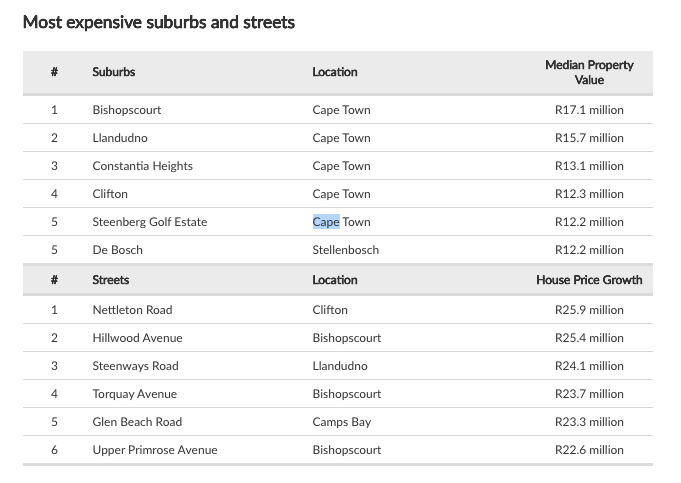 Looking at the most expensive suburbs in Cape Town, Bishopscourt is the most expensive with an average value of R17.1 million, followed by Llandudno, Constantia Heights, Clifton, Steenberg and De Bosch in Stellenbosch.